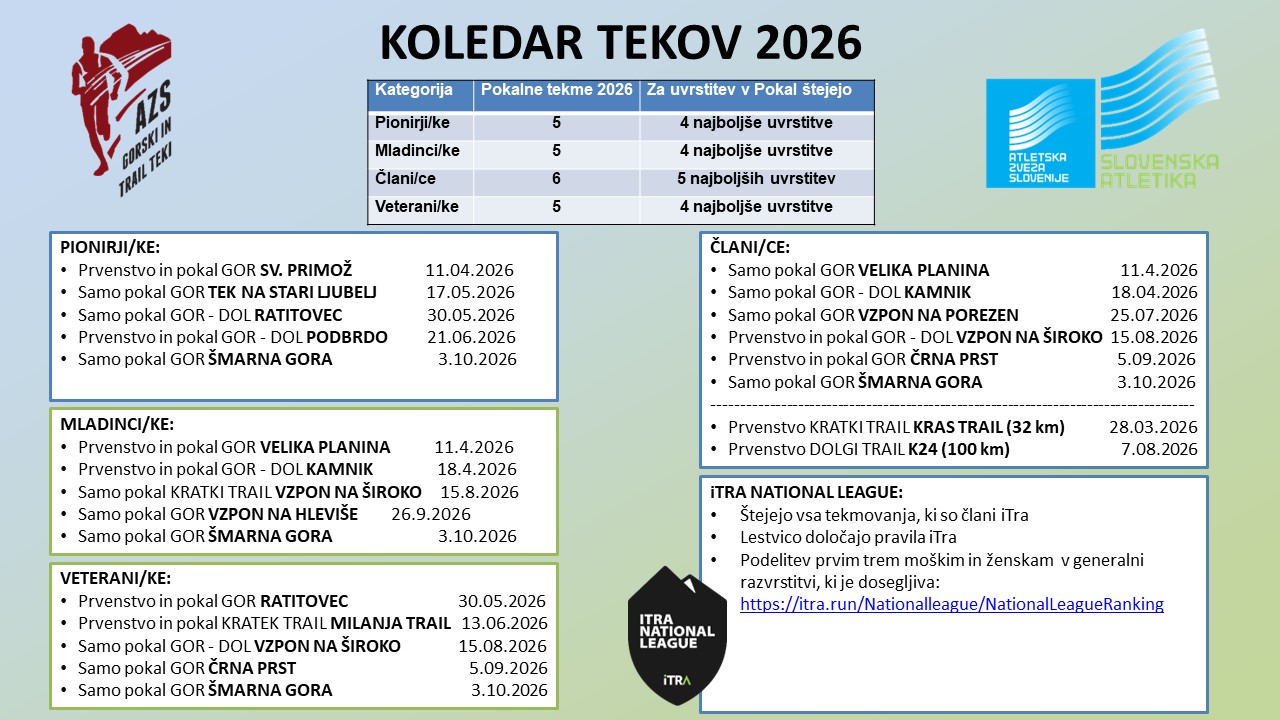 202613jun09:0016:00MILANJA TRAIL 2026Prvenstvo Slovenije kratki trail in pokalna tekma: veterani/ke09:00 - 16:00 OrganizatorTekaško društvo Bistrc